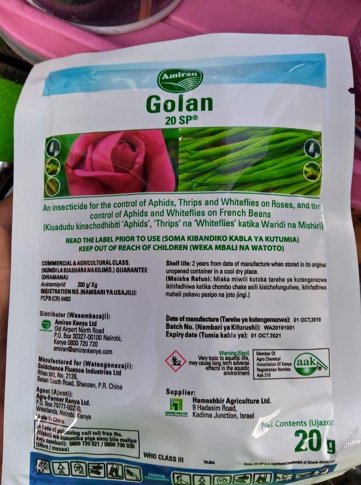 Golan 20 SP is a systemic translaminar insecticide used in the control of whiteflies, thrips, aphids, leaf miners, and mealy bugs.