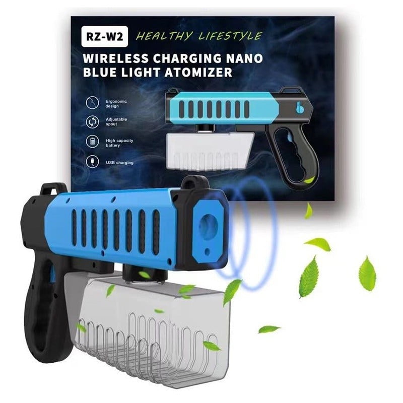 The Wireless Charging Nano Blue Light Atomizer RZ-W2 is a handheld device used for disinfecting a wide range of items and surfaces in homes, offices, factories, cinema halls, etc.