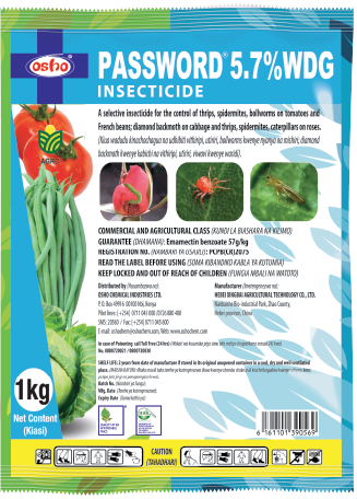 Password 5.7% WDG is an insecticide for the control of thrips, spider mites, bollworms on tomatoes and French beans, diamond back moth on cabbage and caterpillars on roses.